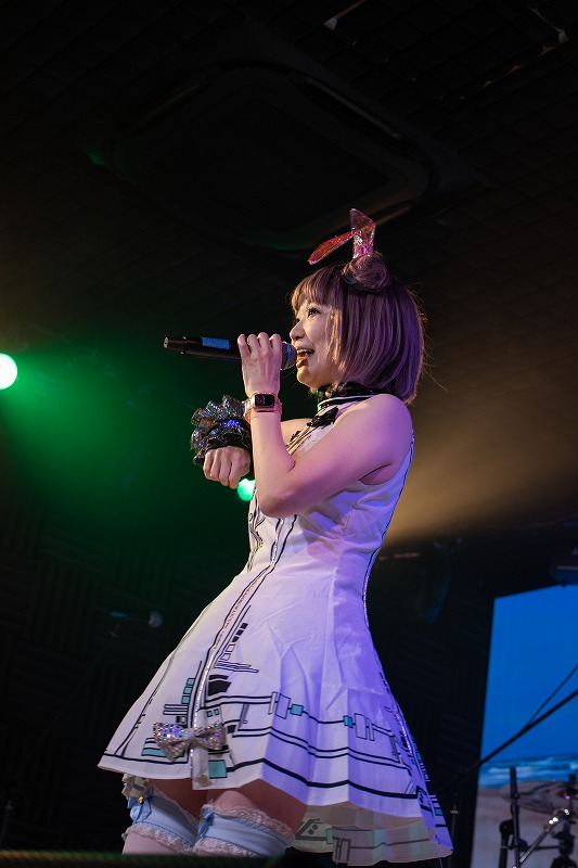 次に届けたのが超レアな、同人音楽のW.M.M(わーるど・まさや・みゅーじっく)として作りあげた『恋スルココロ♥摩訶不思議』。オリエンタル/チャイニーズな旋律をインパクト強く組み込んだ、こちらもトラックのテンポがHYPERに速い楽曲だ。その上で、愛らしく甘い声で歌ううさぎちゃんの姿も印象的だった。この曲の演奏中、背景にパンダなど中華風の映像も投影。どの曲でもだが、楽曲と背景に投影されるVJの映像が巧みにシンクロし続けていたことも伝えておきたい。この曲で見せたうさぎちゃんのダンスも、とても愛らしかった。