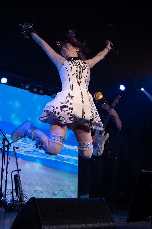 第二部でも、でんぱ組.incの楽曲を継承していこうと、アニキが作編曲、畑亜貴が作詞した、これぞ”萌電波アイドルソング”の『kiss+kissで終わらない』と『ピコッピクッピカッて恋してよ』を立て続けに届けてくれた。愛らしいアイドルのような姿で歌い躍るうさぎちゃんの姿に、胸をキュンキュン萌えさせていた人たちも多かったに違いない。『ピコッピクッピカッて恋してよ』のときには、フロアのあちこちから熱を帯びた声が生まれていた。それにしてもうさぎちゃんには、愛らしいチャーミングなアイドル姿がとても似合う。