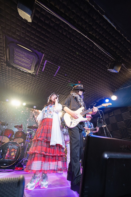最初のコラボコーナーは、ULTRA-PRISMとLittle Non.から。正確に伝えるなら、ノゾミ以外の3人によるSOD(シュン、親分、大生)のステージに、ULTRA-PRISMの2人がコーラスする形でセッションは行われた。うさぎちゃんが叫んだ、「地味なヒーローを呼んでみよう、S,O,D!」の声に合わせて3人がステージへ。SODが歌ったのが、アニキが編曲を手がけた『SODのテーマ2』。少しへなへなだけど、力強い秋葉原の戦士に心を染めた3人の歌う声に合わせて、うさぎちゃんや観客たちが熱い声でかけあう。そのやりとりも、SODらしさ。途中からは、アニキもギターを置いて歌で参加。うさぎちゃんは、みずから用意した紙吹雪をフロア中に振り蒔いていた。この曲の間中、フロア中が「Oi!Oi!」と叫ぶ野太い声で染め上がる景色が最高だ。最後に、ノゾミが登場。そのままLittle Non.のステージへ。